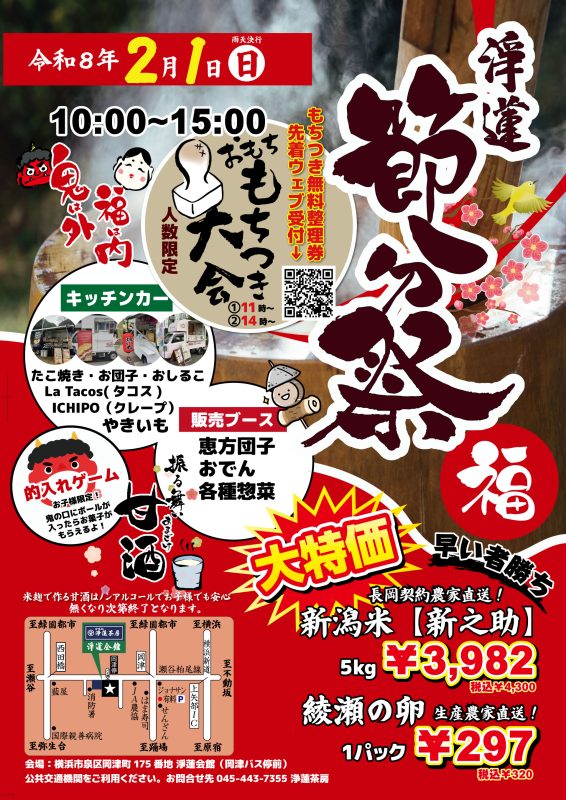淨蓮『節分祭』開催 令和8年2月1日(日)10:00〜15:00 出店場所:横浜市泉区岡津町175番地淨蓮会館駐車場 https://maps.app.goo.gl/LwwauVAfxaLqVrwL6 浄蓮茶房の隣にある淨蓮会館にて、節分祭を開催いたしいます。 お餅つき無料体験(こどものみ)... -